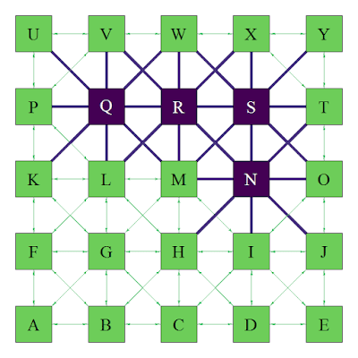 Con el algoritmo de Dijkstra es posible determinar la distancia más corta (de menos esfuerzo o costo) entre un nodo inicial y cualquier otro nodo en un grafo. La idea del algoritmo es calcular continuamente la distancia más corta desde un punto inicial y excluyendo las distancias más largas cuando se efectúa una actualización. Como ejemplo, en el siguiente grid, se asume que los nodos en morado son sumamente costosos, por lo que el algoritmo de Dijkstra deberá hallar la ruta que minimice el costo total entre cualquier tupla de nodos, como por ejemplo, pasar del nodo "A" al nodo "W".